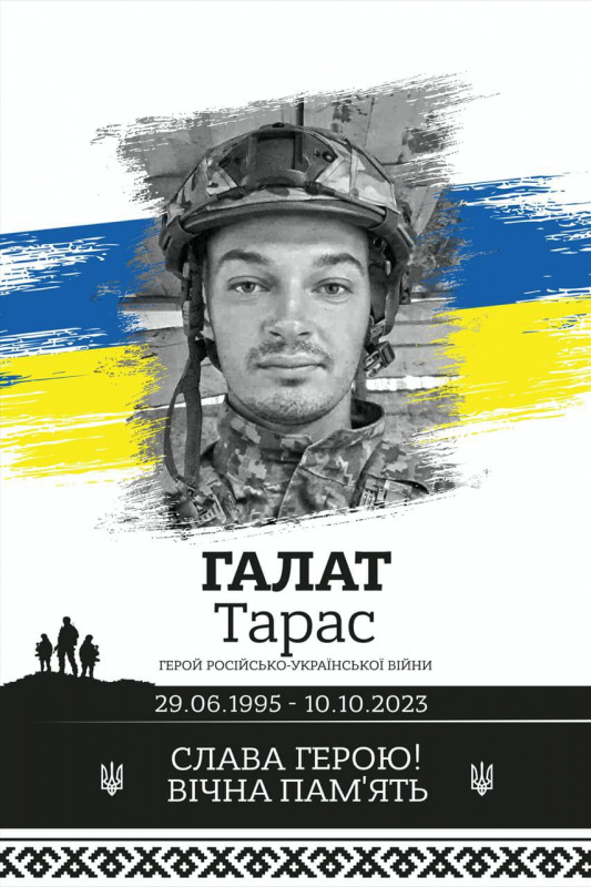 Тарас Галат – 28-річний український військовик, матрос, оператор управління командира 3-тьої самохідної артилерійської батареї 2-го самохідного артилерійського дивізіону військової частини А4765. Загинув 10 жовтня 2023 року від отриманих поранень, несумісних з життям, під час виконання бойових завдань у Херсонській області.