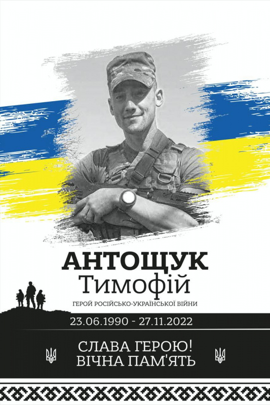 Загинув Тимофій Антощук 27 листопада 2022 року поблизу міста Бахмута Донецької області під час бойового зіткнення з підрозділами регулярних збройних сил російської федерації із застосуванням стрілецької зброї, АГС, мінометів, артилерії, витягуючи пораненого побратима.