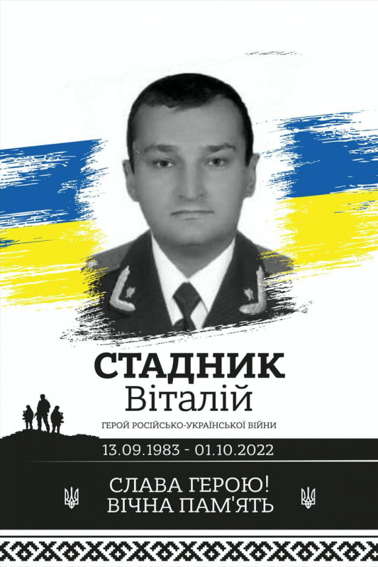Віталій Стадник – 39-річний український військовик, старший радник юстиції, матрос Військово-Морських Сил Збройних Сил України. Загинув 1 жовтня 2022 року на Херсонщині, вивозячи поранених із поля бою.