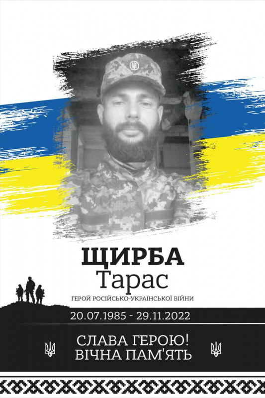 Тарас Щирба – 37-річний український військовослужбовець, солдат Збройних сил України. Загинув 29 листопада 2022 року, стримуючи збройну агресію ворога біля смт Курдюмівка на Донеччині.