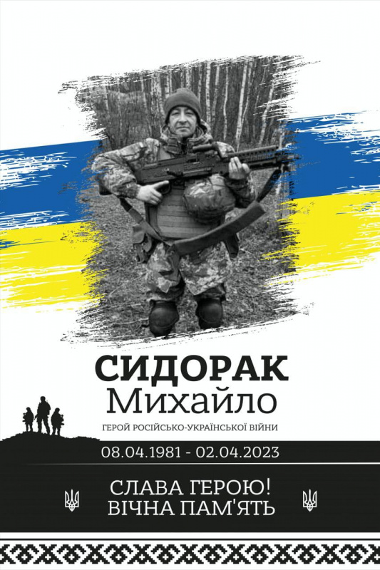 Михайло Сидорак – 41-річний український військовик, навідник аеромобільного батальйону військової частини А4355, солдат 77 ОАеМБр. Загинув 2 квітня 2023 року під час виконання бойового завдання на Донеччині.
