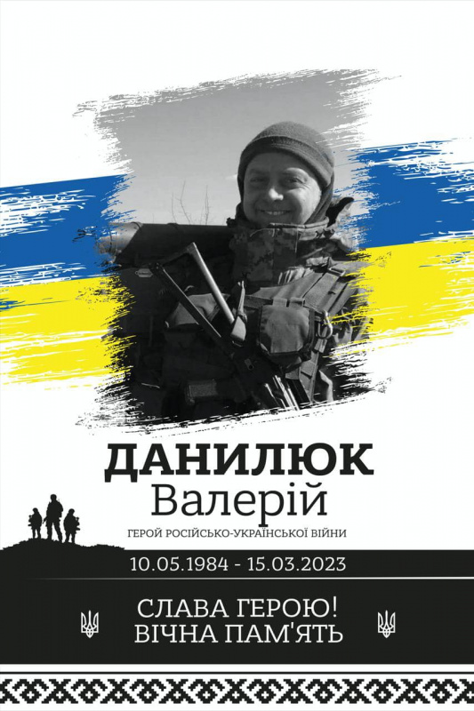 Валерій Данилюк — 38-річний український військовик, водій третього відділення ракетного взводу військової частини А4248, учасник російсько-української війни. Загинув 15 березня 2023 року під час виконання бойового завдання на Донеччині.