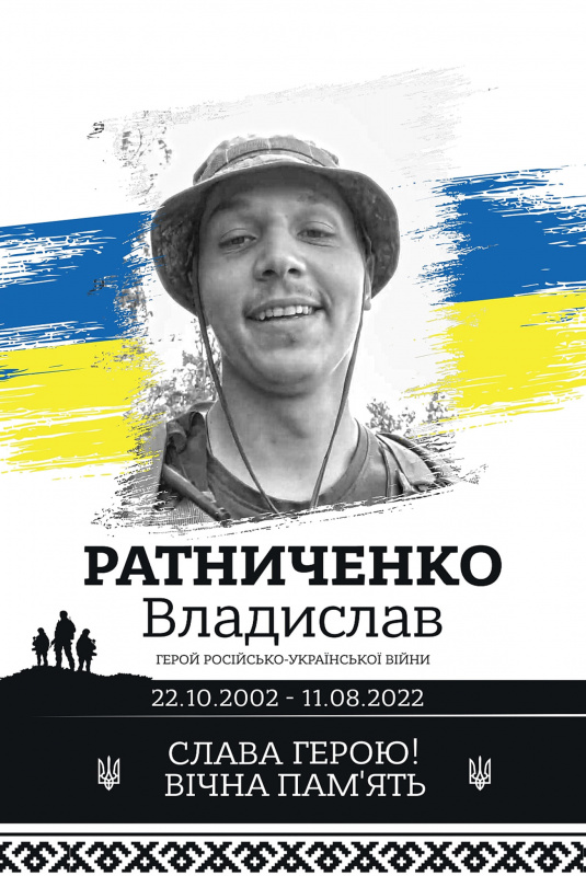 Владислав Ратниченко - 19-річний український військовик, солдат, служив старшим навідником відділення гранатометного взводу механізованого батальйону Окремої президентської бригади ім. гетьмана Богдана Хмельницького, позивний «Радик».Загинув 11 серпня 2022 року внаслідок травм, отриманих під час мінометного обстрілу,в Малинівці на Донеччині.
