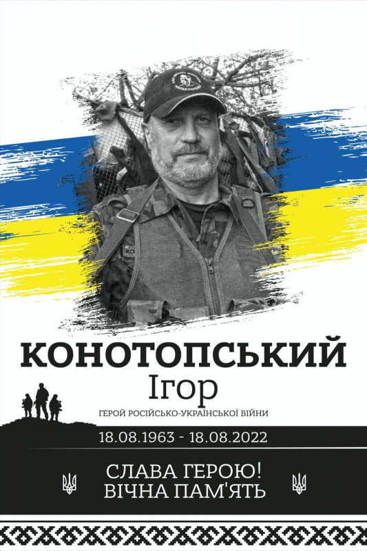 Ігор Конотопський– 59-річний український військовик, солдат Збройних сил України, учасник російсько-української війни. Загинув 18 серпня 2022 року під час виконання військового обов’язку на Сумщині.
