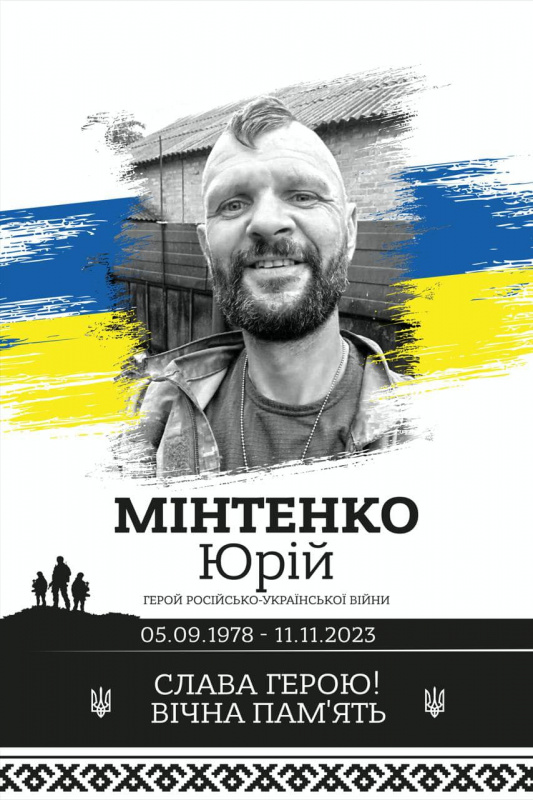 Мінтенко Юрій - 45-річний український військовик, солдат, гранатометник 17-го окремого мотопіхотного батальйону. Герой віддав своє життя за українську націю та рідну землю 11 листопада 2023 року у Харківській області під час виконання бойового завдання.