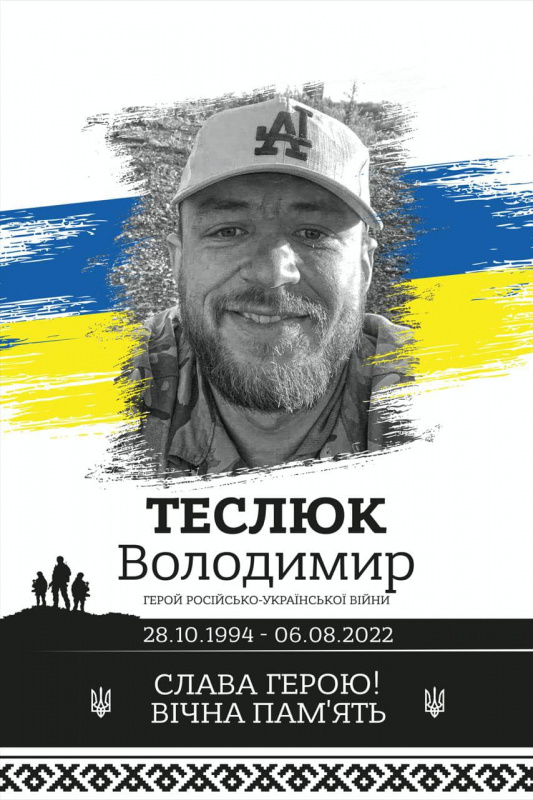 Володимир Теслюк – 28-річний український військовик, солдат, стрілець першої стрілецької роти 105-ї бригади територіальної оборони. Загинув 6 серпня 2022 року внаслідок артилерійського обстрілу у місті Краснопілля Краматорського району на Донеччині.