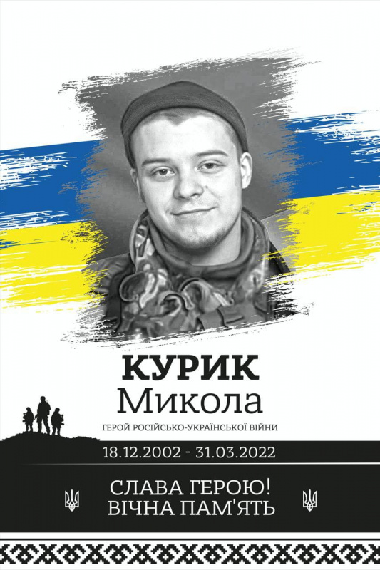 Микола Курик – 19-річний український військовослужбовець, солдат в/ч А0336, позивний «Калаш», учасник російсько-української війни. Загинув 31 березня 2022 року на Київщині під час виконання бойового завдання.