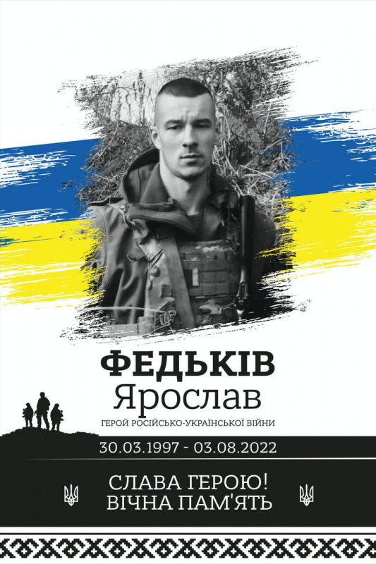 Ярослав Федьків – 25-річний український військовик, солдат загону спеціального призначення в/ч А 4027. Загинув 3 серпня 2022 року у місті Новопілля Донецької області, внаслідок стрілецького бою з групою противника, отримавши кульове поранення, несумісне з життям.
