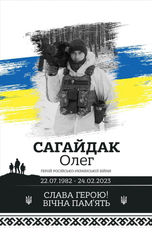 Олег Сагайдак - 41-річний український військовик, старший солдат, в/ч А 7170 (105 ОБрТрО). Загинув 24 лютого 2023 року біля села Масютівка Куп’янського району Харківської області.