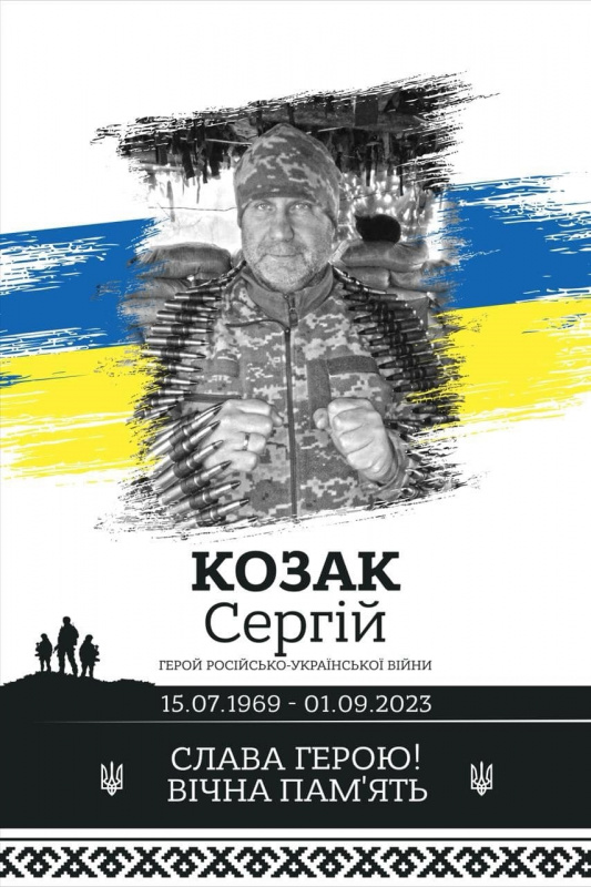 Сергій Андрійович Козак - 54-річний український військовик, молодший сержант, головний сержант-командир відділення кулеметного взводу стрілецької роти військової частини А4084. Загинув 1 вересня 2023 року під час виконання бойового завдання у селищі Нью-Йорк в Донецькій області.