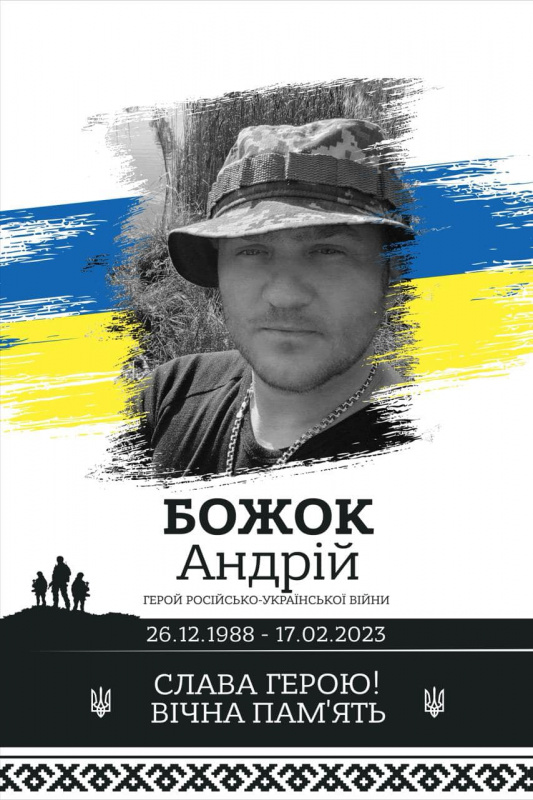 Андрій Божок - 35-річний український військовик, солдат, номер обслуги 1 мінометного взводу 2 мінометної батареї 1 механізованого батальйону військової частини А0536. Загинув 17 лютого 2023 року під час виконання бойового завдання, пов’язаного із захистом територіальної цілісності та суверенітету України, біля населеного пункту Авдіївка Донецької області.