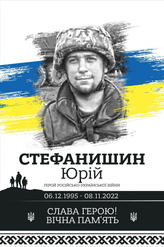 Юрій Стефанишин — 26-річний український військовик, солдат, військова частина А3802. Загинув 8 листопада 2022 року у селі Яковлівка Донецької області.