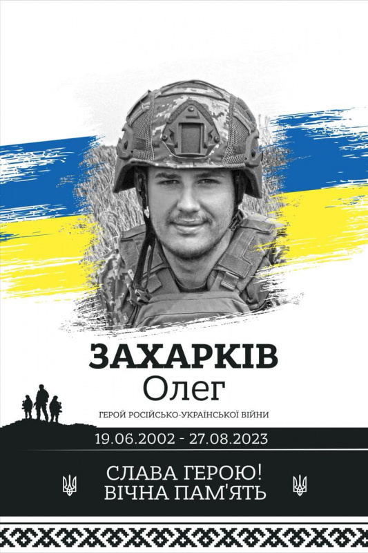 Олег Захарків - 21-річний український військовик, солдат, командир інженерно-саперного відділення інженерно-саперного взводу саперної роти військової частини А 4722, псевдо «Карат». Загинув 27 серпня 2023 року під час виконання бойового завдання поблизу населеного пункту Роботине у Запорізькій області.