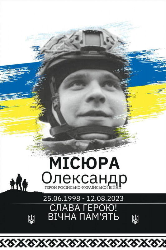 Олександр Місюра – 25-річний український військовик, солдат, старший навідник 3-го відділення протитанкових ракетних комплексів 1-го взводу протитанкових ракетних комплексів 2-ої роти протитанкових ракетних комплексів протитанкового батальйону 3-ої окремої штурмової бригади, військова частина А 4638, позивний «Бухгалтер». Загинув 12 серпня 2023 року на околиці міста Бахмута.