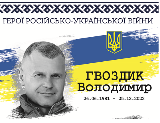 Володимир Гвоздик – 41-річний український військовик, солдат 24 ОМБр Збройних сил України, гранатометник 2 стрілецького відділення 1 стрілецького взводу 6 стрілецької роти 2 стрілецького батальйону військової частини А0998. Загинув 25 грудня 2022 року під час бойового зіткнення і обстрілу противника поблизу населеного пункту Бахмут на Донеччині.