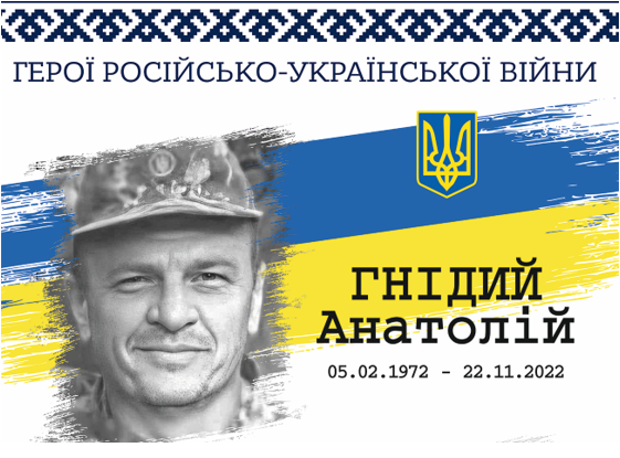 Анатолій Гнідий – 50-річний український військовик, старший солдат, номер обслуги розрахунку самохідного артилерійського взводу самохідної артилерійської батареї самохідного артилерійського дивізіону військової частини №А 0693. Загинув 22 листопада 2022 року біля населеного пункту Спірне Донецької області.