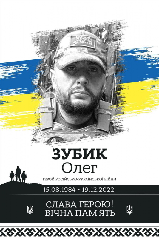 Стрілець-снайпер механізованого батальйону 24 ОМБр в окремій механізованій бригаді імені короля Данила Олег Зубик загинув 19 грудня 2022 року в с. Кліщіївка Донецької області.