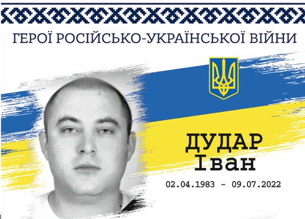 Дудар Іван – 39-річний український військовик, солдат, рядовий 24-ї окремої механізованої бригади імені короля Данила, в/ч А0998. Загинув 9 липня 2022 року внаслідок ракетного удару російських військових по місту Часів Яр Донецької області.