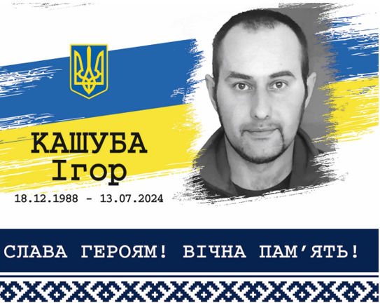 Кашуба Ігор - 25-річний український військовик, солдат, кулеметник, військова частина 3028 Національної Гвардії України. Загинув 13 липня 2024 року в районі населеного пункту Калинівка Вінницької області внаслідок ДТП.