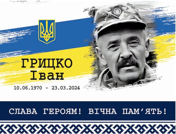 Грицко Іван Якович - 53-річний український військовик, солдат, рядовий, водій гранатометного відділення роти вогневої підтримки військової частини в/ч А 0501. Загинув 23 березня 2024 року в районі села Райгородок (Брусівка) Краматорського району Донецької області.