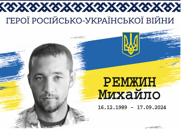 Ремжин Михайло Вікторович – 34-річний молодший сержант, командир мотопіхотного відділення мотопіхотного взводу мотопіхотної роти мотопіхотного батальйону військової частини А 0693. Загинув 19 вересня 2024 року під час виконання бойового завдання поблизу населеного пункту Івано-Дар’ївка Бахмутського району Донецької області.