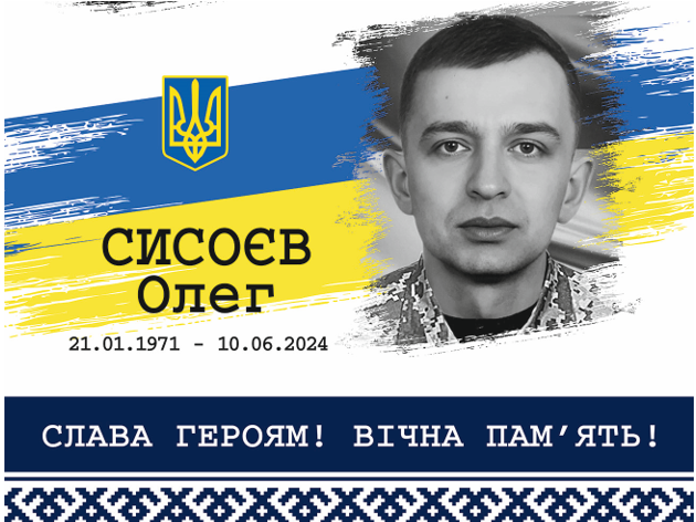 Сисоєв Олег Юрійович – 53-річний український військовик, старший солдат, номер обслуги 1 єгерського відділення 2 єгерського взводу 1 єгерської роти 1 єгерського батальйону військової частини А 4056. Загинув, виконуючи бойове завдання, 10 червня 2024 року в районі населеного пункту Семенівка Покровського району Донецької області.