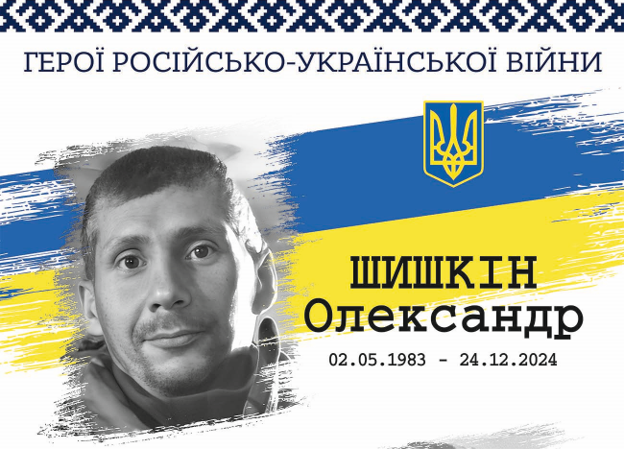 Шишкін Олександр Олександрович – 41-річний український військовик, солдат, стрілець-санітар 1 єгерського відділення 2 єгерського взводу 6 єгерської роти 2 єгерського батальйону військової частини А 4056. Загинув 24 грудня 2024 року біля населеного пункту Відродження Покровського району Донецької області.