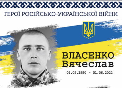 Власенко Вячеслав Андрійович – 32-річний український військовик, молодший сержант, головний сержант-командир інженерно-саперного відділення інженерно-саперного взводу військової частини А3892. Загинув під час виконання бойового завдання 1 червня 2022 року у місті Покровськ Покровського району Донецької області.