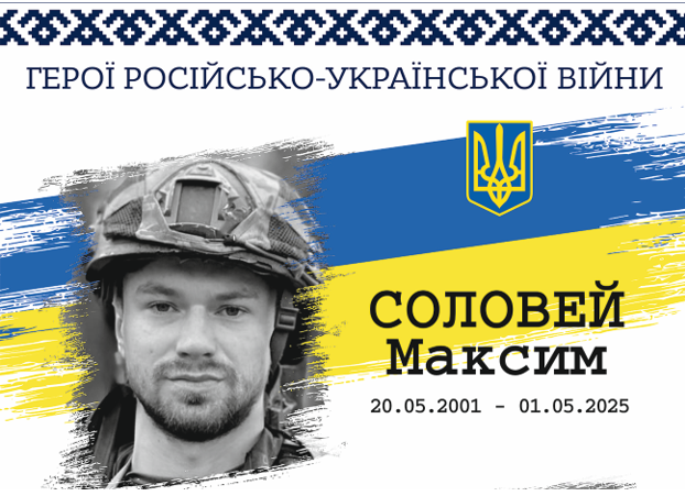 Соловей Максим Олегович – 23-річний український військовик, старший солдат, командир відділення 1 зенітного кулеметного відділення 3 зенітного кулеметного взводу зенітно-кулеметної батареї зенітного ракетно-артилерійського дивізіону військової частини А4056, позивний «Мася». Загинув 1 травня 2025 року під час виконання бойового завдання за призначенням в районі населеного пункту Муравка Покровського району Донецької області.