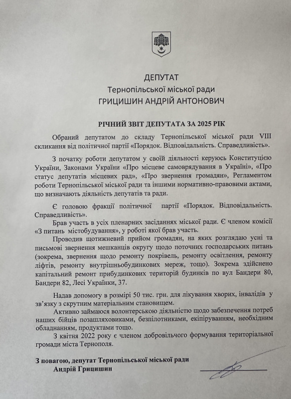 Звіт про депутатську діяльність за 2025 рік Звіт про депутатську діяльність за 2024 рік Звіт про депутатську діяльність за 2023 рік |