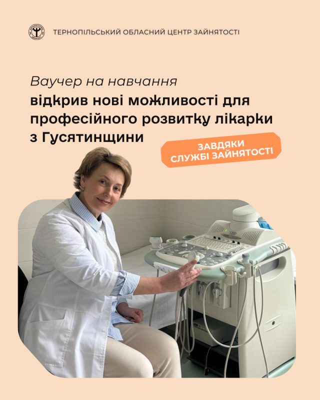 Із соціальних мереж лікарка дізналася про можливість навчання за програмою ваучерів від Державної служби зайнятості та звернулася до фахівців Гусятинського управління Чортківської філії Тернопільського обласного центру зайнятості. Уже в серпні вона отримала ваучер на підвищення кваліфікації за освітньою програмою «Ультразвукова діагностика», а з 1 вересня 2025 року стала слухачкою курсів на базі Львівського національного медичного університету імені Данила Галицького.