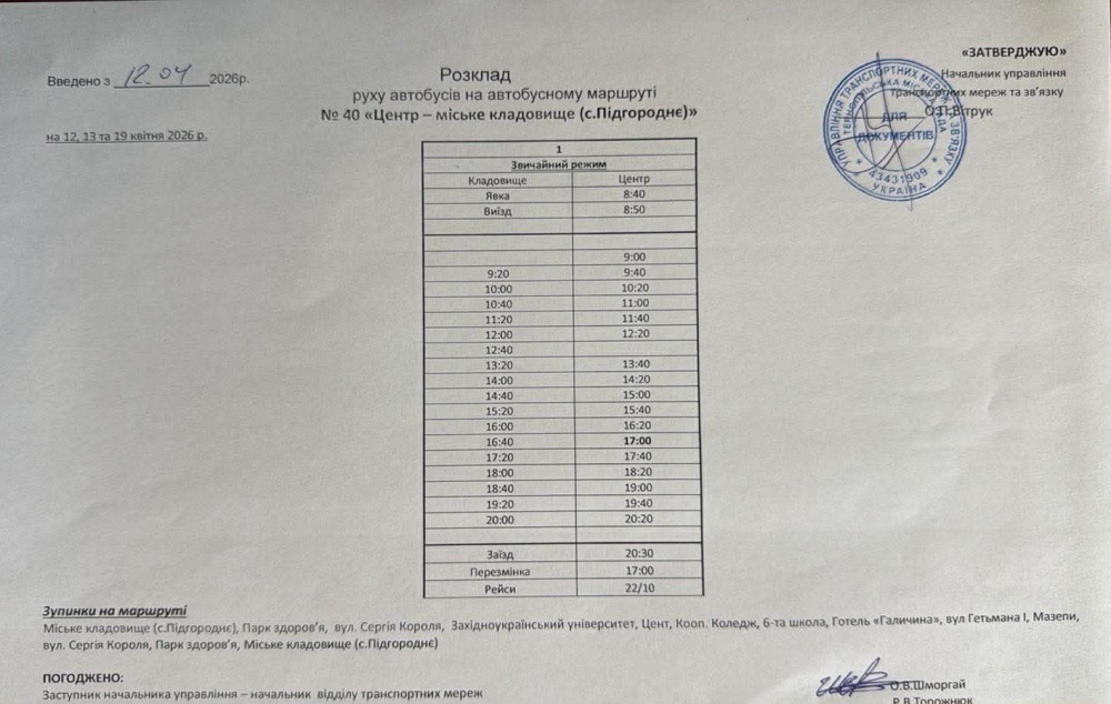 Розклад руху автобусного маршруту №40 (додається), (12,13,19 квітня)