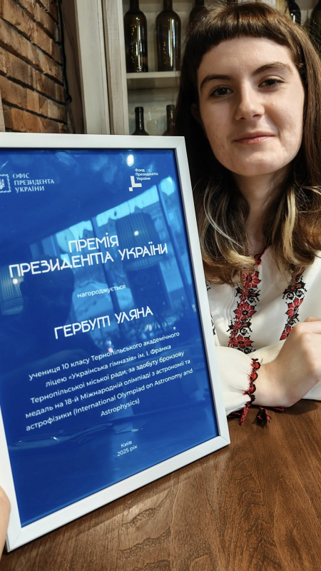 Випускниця Тернопільського академічного ліцею «Українська гімназія» імені Івана Франка 2025 року Уляна Гербут отримала сертифікат на здобуття премії Президента України. Із цим досягненням тернополянку особисто привітав Володимир Зеленський.