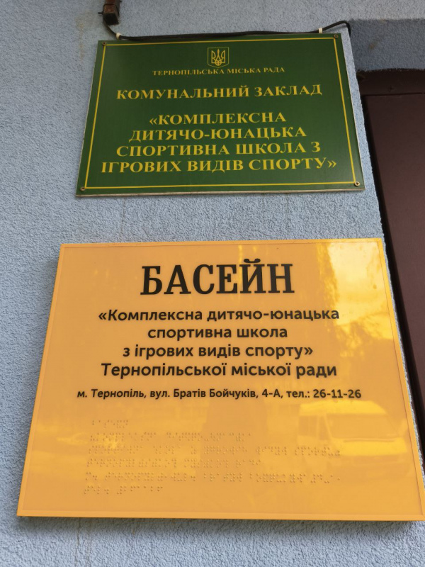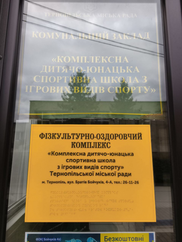 З метою забезпечення доступу до інформації та можливості самостійної орієнтації для осіб з порушенням зору, біля головного входу до комплексу встановлено тактильну інформаційну табличку, надруковану шрифтом Брайля. Подібні таблички з'явилися і на фасадах інших спортивних закладів міста - «Комплексної дитячо-юнацької спортивної школи №1» та «Комплексної дитячо-юнацької спортивної школи №2 імені Юрія Горайського».
