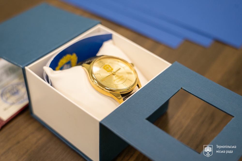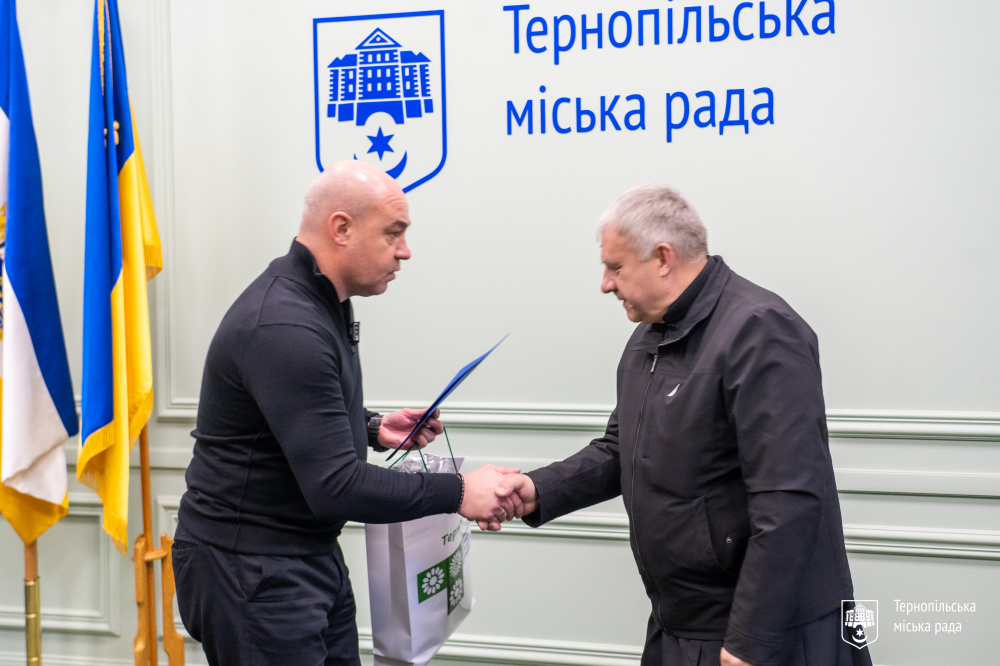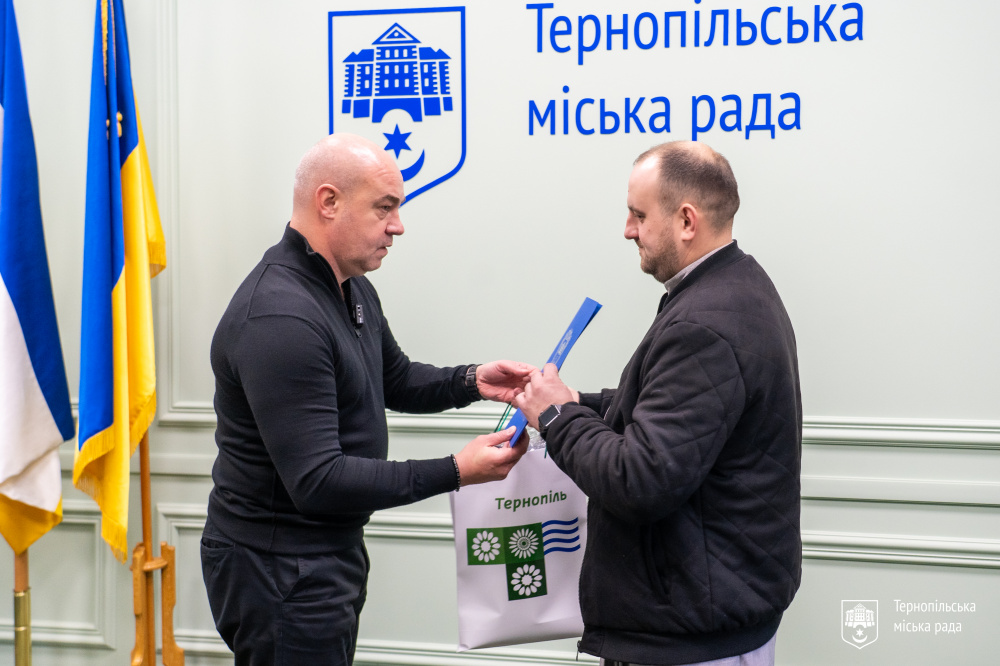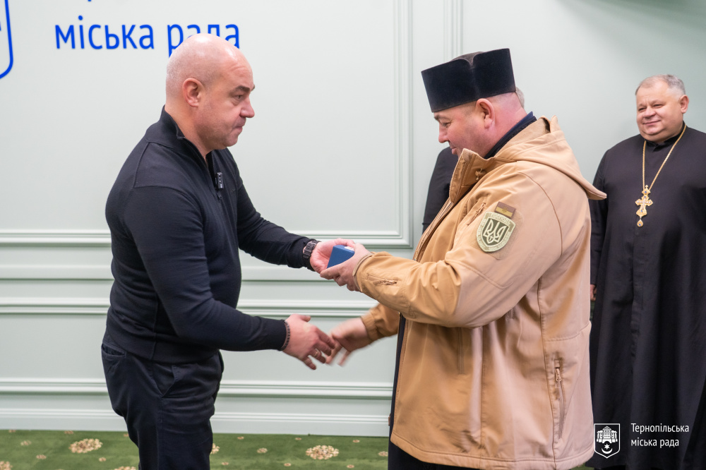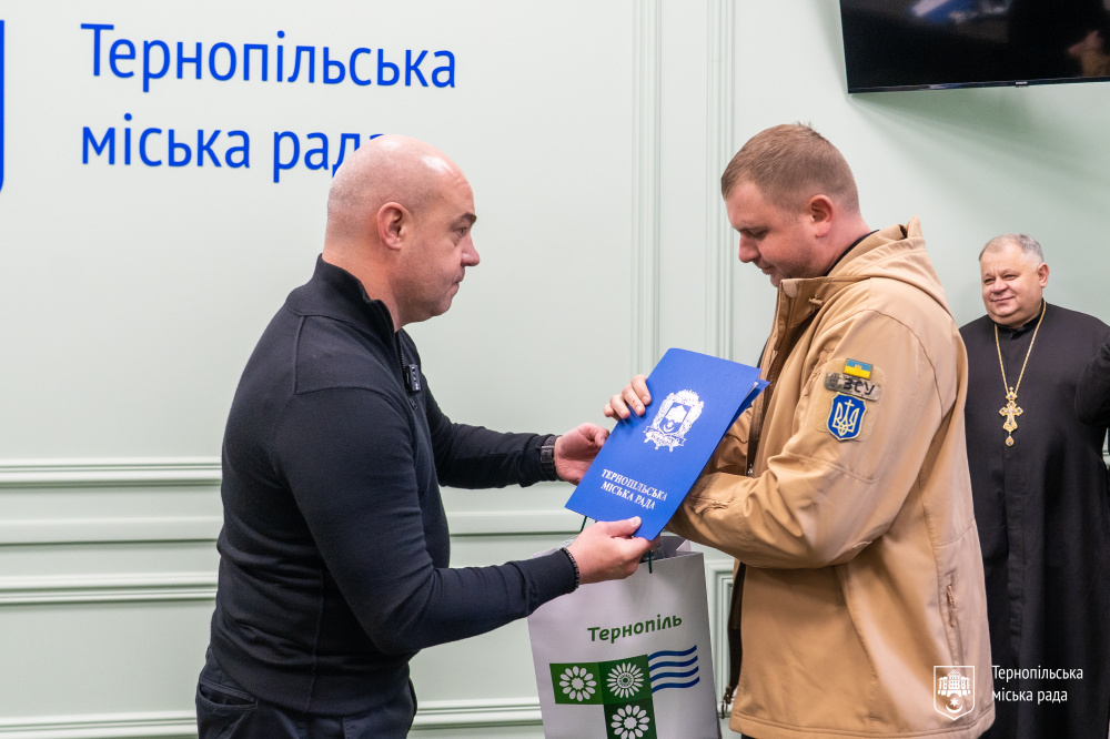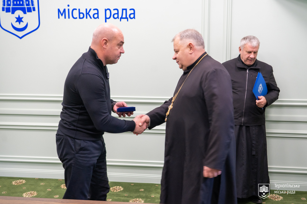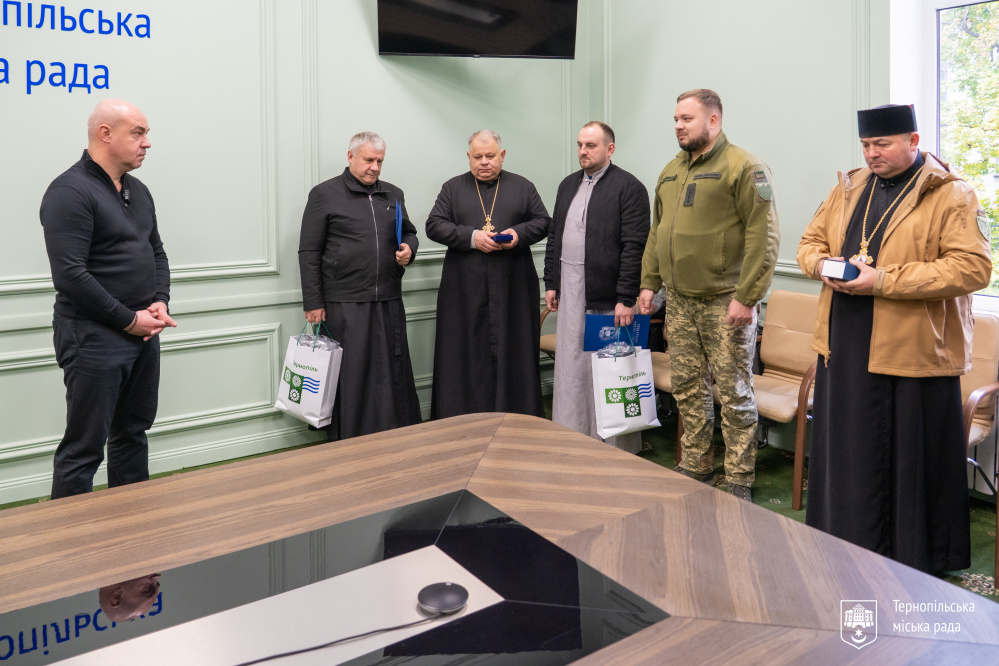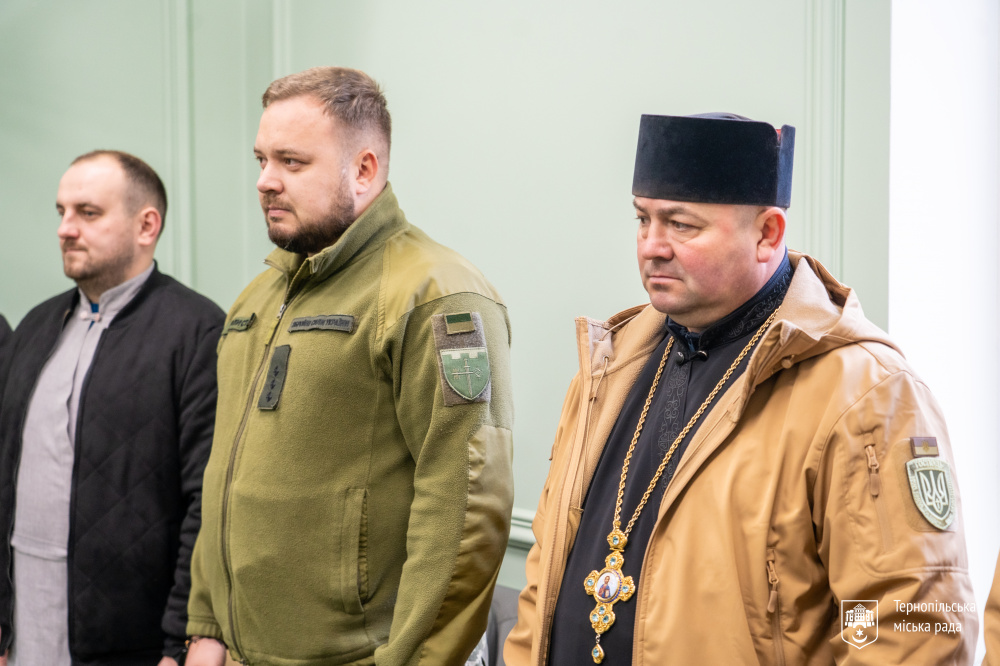 В Тернопільській міській раді відбулися урочистості, під час яких капеланів, що несуть службу на фронті, нагородили подяками, відзнаками та цінними подарунками, які вручив міський голова.