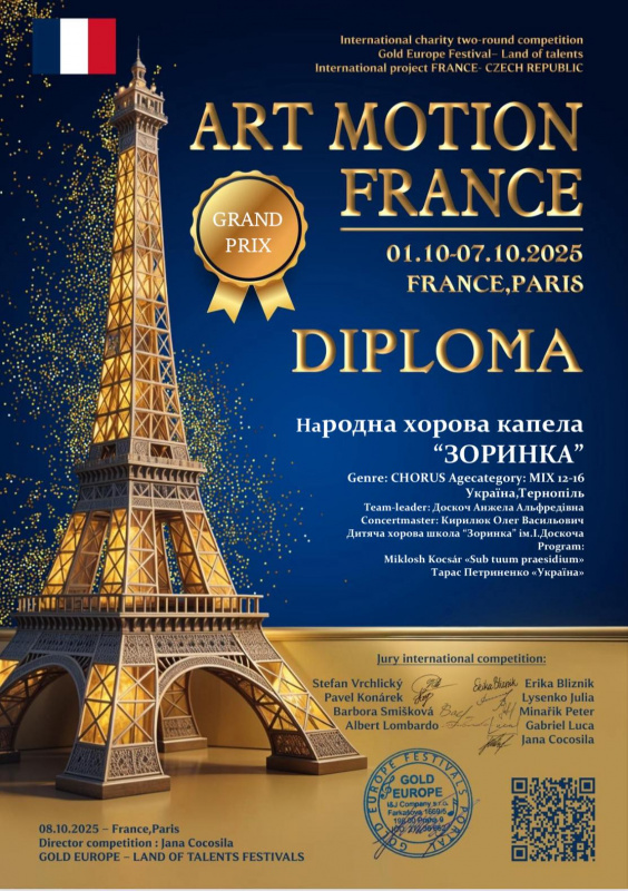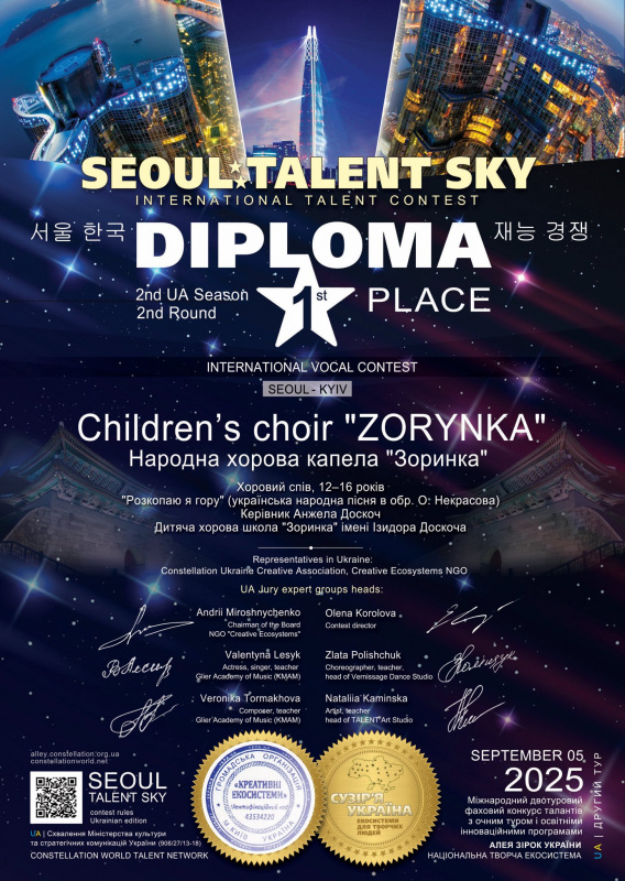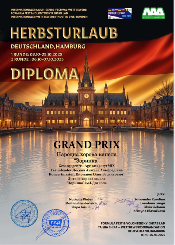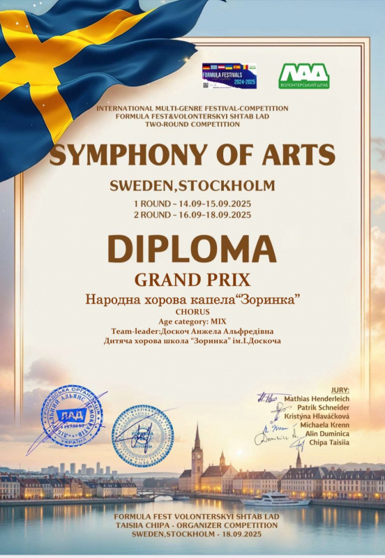 Народна хорова капела «Зоринка» тріумфально завершила серію виступів за кордоном, здобувши одразу чотири престижні нагороди на міжнародних конкурсах у Швеції, Німеччині, Франції та Південній Кореї. Юні артисти вкотре гідно представили Україну на світовій сцені, прославляючи наше мистецтво далеко за межами держави.