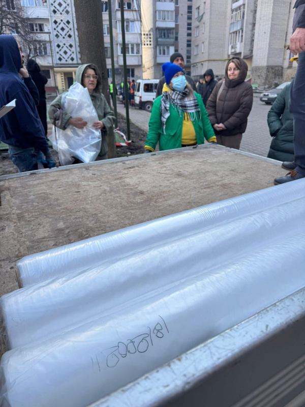 Станом на 14:00 працює техніка, сформовані бригади, також залучені управителі багатоквартирних будинків, які займаються закриттям місць загального користування плівкою.