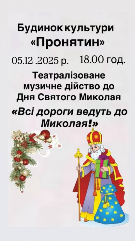 Святкову програму також представлять у Будинку культури «Пронятин». Тут 5 грудня о 18:00 запрошують дітей та батьків на чарівне театралізоване дійство із зустріччю зі Святим Миколаєм та його помічниками. Глядачам обіцяють святкову атмосферу, захопливі пригоди та можливість зануритися в казкову історію, що подарує незабутні емоції.