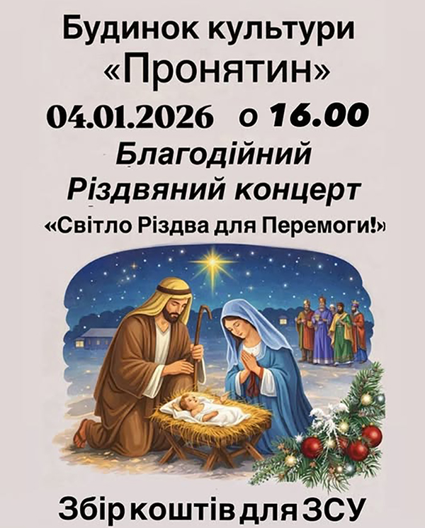 У Будинку культури «Пронятин» у неділю, 4 січня 2026 року, відбудеться благодійний різдвяний концерт «Світло Різдва для Перемоги». Початок заходу - о 16:00.