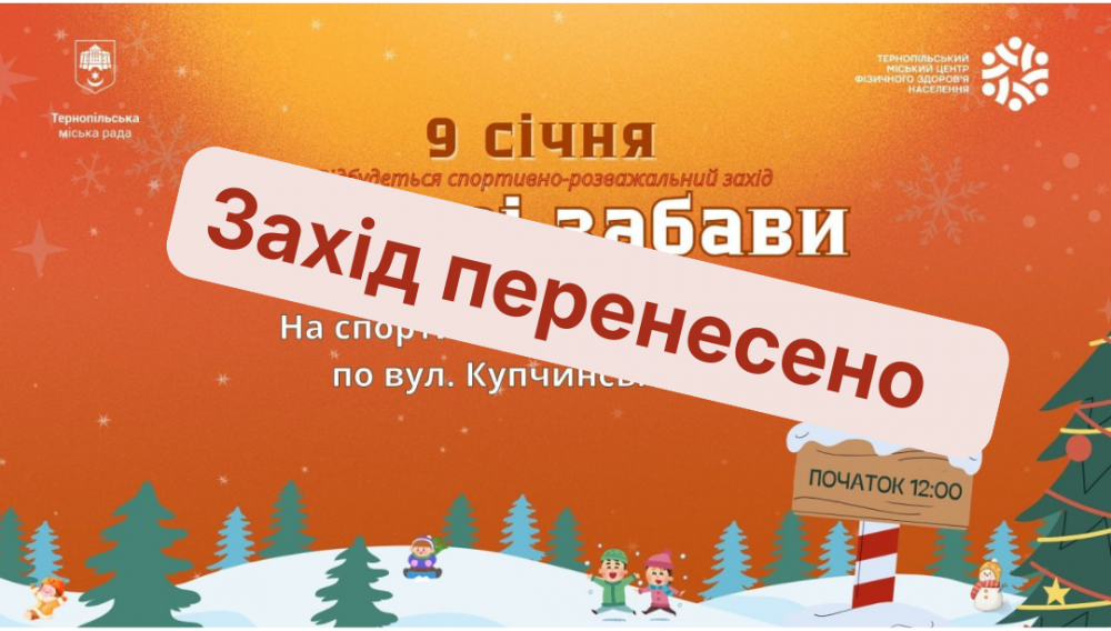 У зв’язку з погодними умовами спортивно-розважальний захід «Зимові забави» перенесено. Захід мав відбутися сьогодні, 9 січня на спортивному майданчику за адресою вул. Романа Купчинського, 1.