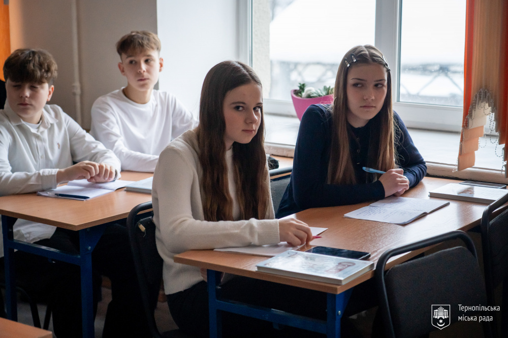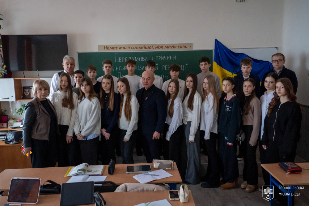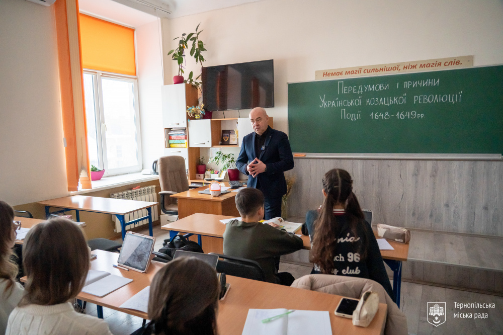 В рамках тематичного заняття учні 8-Г класу обговорювали події української козацької революції 1648-1649 років. Тож міський голова звернувся до школярів, підкресливши на важливості патріотизму та здобуття знань для майбутнього держави.