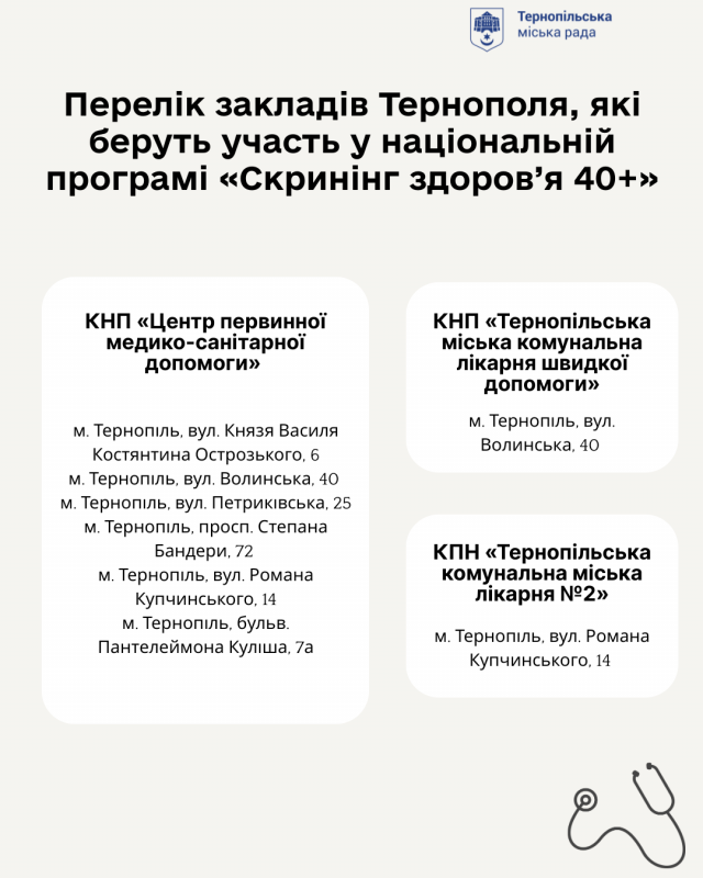 Учасники самостійно обирають медичний заклад із затвердженого переліку - державний, комунальний або приватний, незалежно від місця проживання чи реєстрації. Зокрема у Тернополі три медичні установи готові надавати послугу «Скринінг здоров’я 40+»: