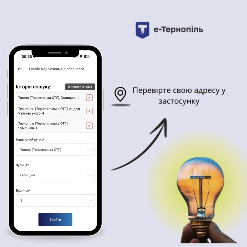 У додатку відображається графік відключень від «Тернопільобленерго», і тепер введену адресу можна зберегти. Щоб змінити її, достатньо ввести нову, а всі збережені адреси будуть доступні для швидкого перемикання між ними. Окрім того, якщо якась адреса неактуальна, її можна видалили.