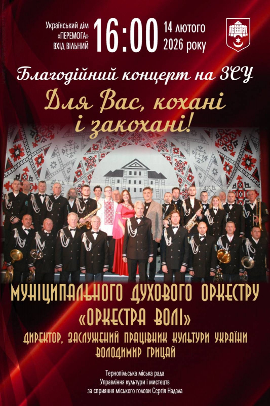 Муніципальний духовий оркестр «Оркестра Волі» запрошує тернополян і гостей міста на благодійний концерт «Для Вас, кохані і закохані!». Захід, присвячений Дню святого Валентина, відбудеться у суботу, 14 лютого, в Українському домі. Початок дійства - о 16:00.