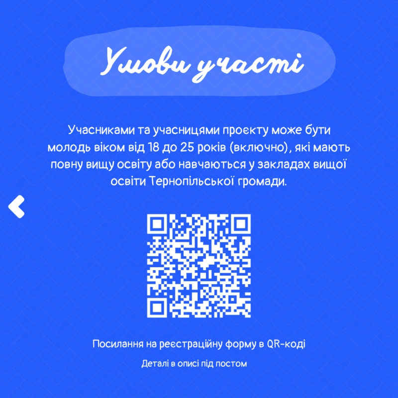 Подати заявку можуть молоді люди віком від 18 до 25 років включно, які мають вищу освіту або навчаються у закладах вищої освіти Тернопільської міської територіальної громади. Реєстрація триватиме до 5 березня 2026 року включно за посиланням ТУТ.