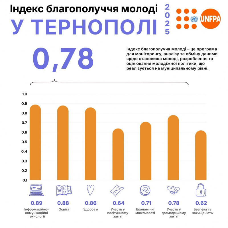 Міська територіальна громада за підтримки управління сім'ї, молодіжної політики та захисту дітей Тернопільської міської ради вже шостий рік поспіль провела опитування молоді в рамках ініціативи ІБМ спільно з Фондом Народонаселення ООН в Україні (UNFPA Ukraine). У 2025 році Тернопіль отримав найвищий показник - 0,78.