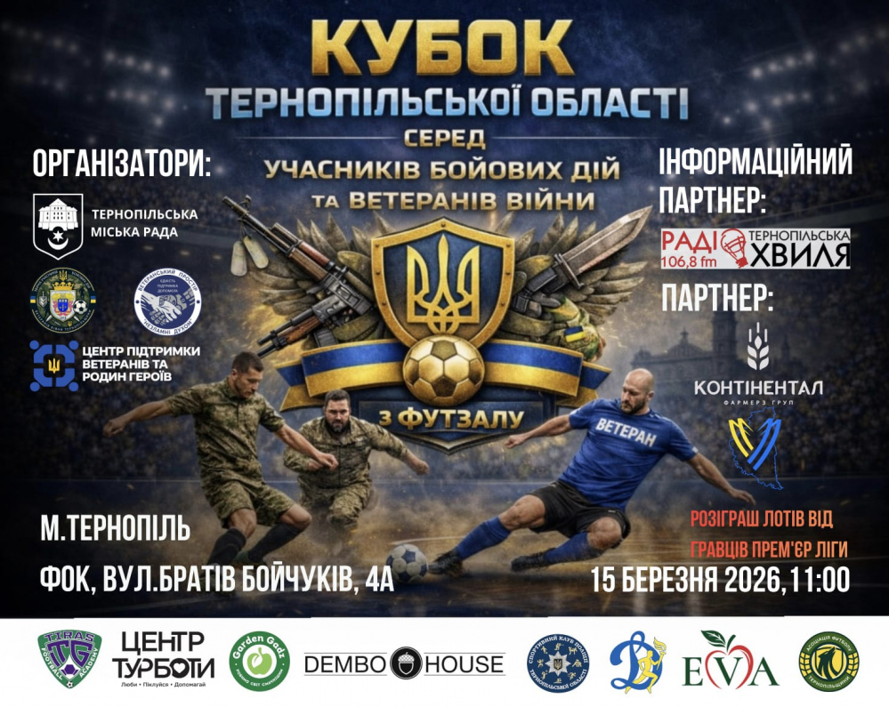 15 березня у Тернополі відбудеться Кубок Тернопільської області з футзалу серед учасників бойових дій та ветеранів війни. Змагання розпочнуться о 11:00 год. у фізкультурно-оздоровчому комплексі за адресою: вул. Братів Бойчуків, 4а.