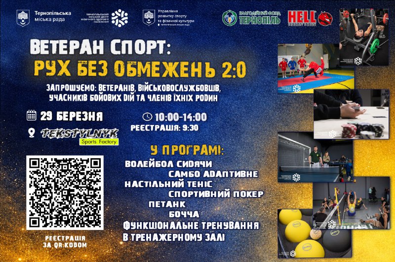 29 березня у Тернополі в комплексі Текстильник Sports Factory відбудеться День спортивних майстер-класів «Ветеран Спорт «Рух без обмежень 2.0». Захід об’єднає ветеранів, військовослужбовців, учасників бойових дій, людей з інвалідністю внаслідок війни та їхні родини.
