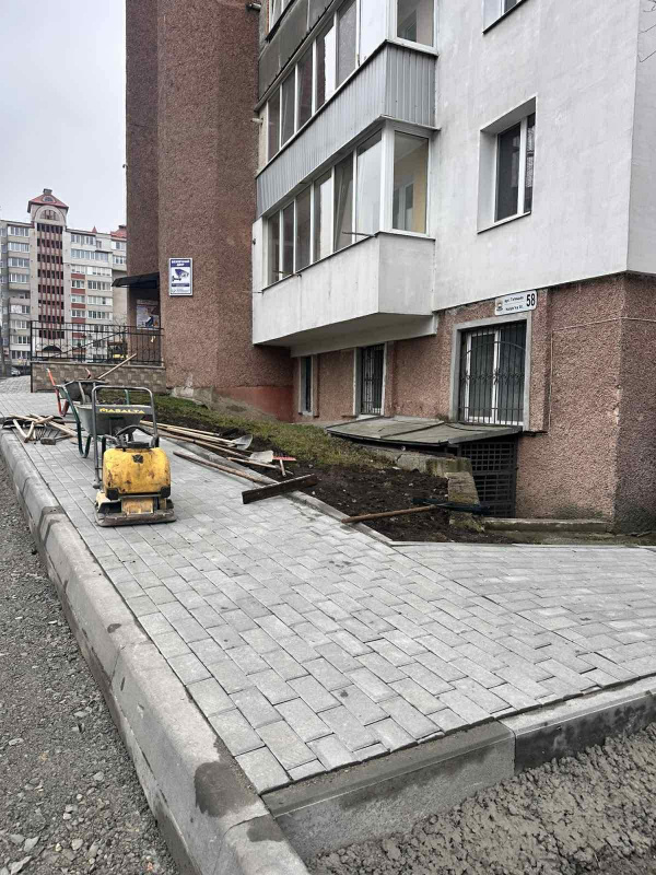 Ведуться роботи і на прибудинковій території за адресою Антіна Монастирського, 40. Тут триває встановлення бордюрів та влаштування основи тротуару.