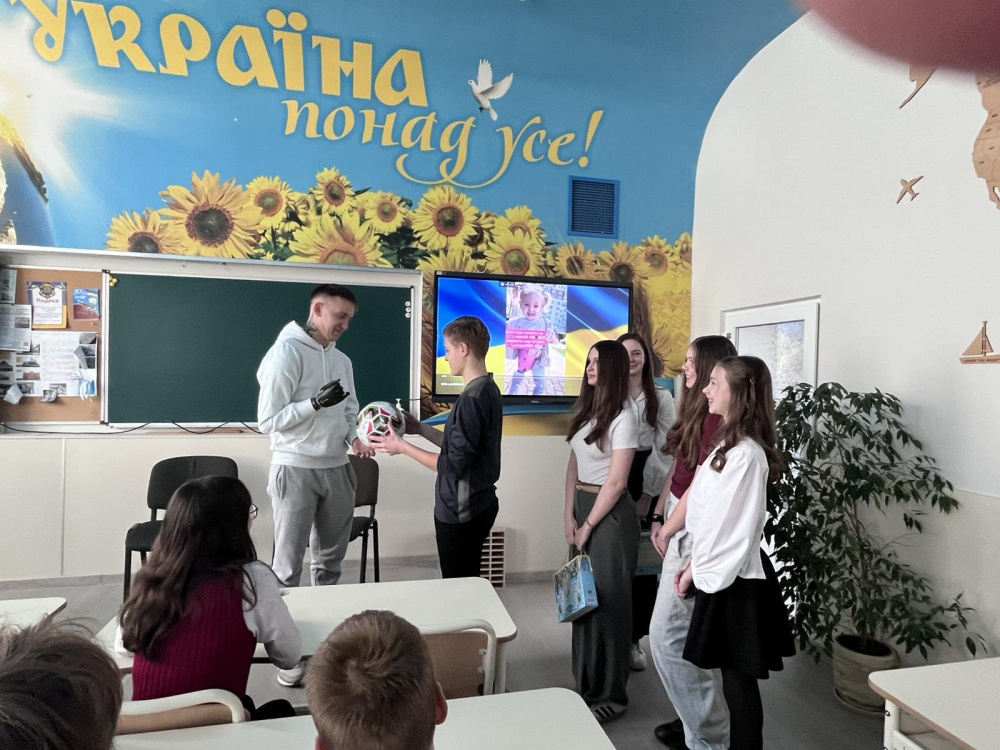 Як знак уваги учні подарували герою футбольний м’яч з автографами, адже він до початку війни грав у складі молодіжної команди «Металіст» (м. Харків). Під час заходу також було передано кошти на придбання авто для воїнів 53 бригади, зібрані учнями напередодні.